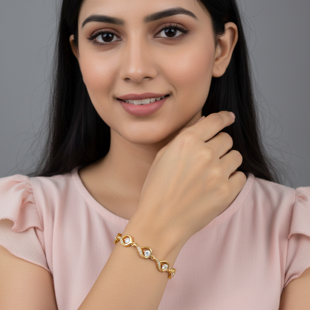 Meet the Golden Swirl Bracelet, a refined blend of sparkle and sophistication. Each crystal is gracefully wrapped in a swirl-shaped gold frame, creating a flowing, wave-like pattern that shines from every angle. The added micro-stone detailing enhances its brilliance, making the bracelet a perfect choice for both everyday elegance and special occasions.